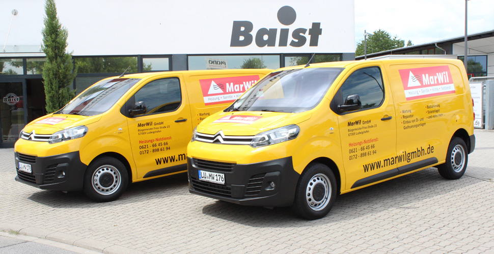 Für die Firma MarWil aus Ludwigshafen wurden von uns sämtliche Fahrzeuge in einem einheitlichen Design gestaltet und foliert. So entstand eine Außenwerbung mit hohem Wiedererkennungswert.