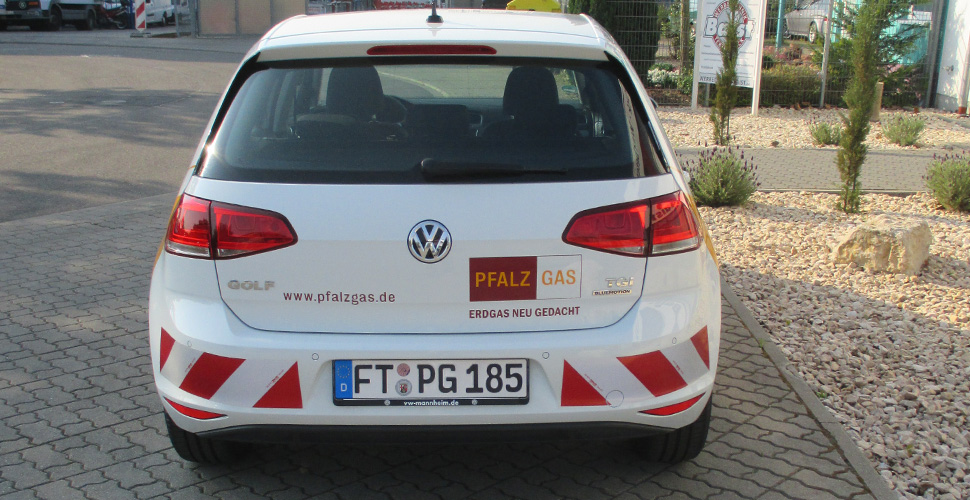 Ob PKW, Caddy oder Sprinter, die gesamte Fahrzeugflotte von Pfalzgas aus Frankenthal wurde im Corporate Design des Unternehmens beschriftet. Dabei mussten die Vorlagen für jeden Fahrzeugtyp entsprechend umgestaltet und angepasst werden.